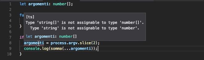 All’interno del file app.ts abbiamo specificato che la variabile argomenti è un array di tipo number. Provando quindi ad assegnare a quest’ultima l’array restituito dalla funzione process.argv.slice(2), ci viene segnalato un errore. (La funzione Array.prototype.slice([inizio[, fine]]) restituisce una copia dell’array originale contenente, in questo caso, gli ultimi due elementi dell’array originale)