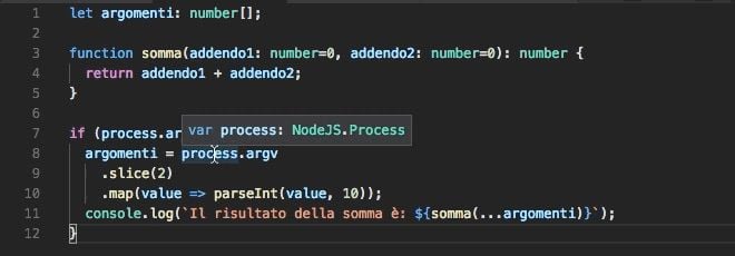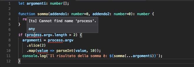 Infatti, è bene sottolineare che nell’esempio appena visto abbiamo usato alcune variabili globali di Node.js come l’oggetto process. Normalmente TypeScript mostrerebbe un messaggio di errore come quello riportato sotto perché non riconosce la variabile process.