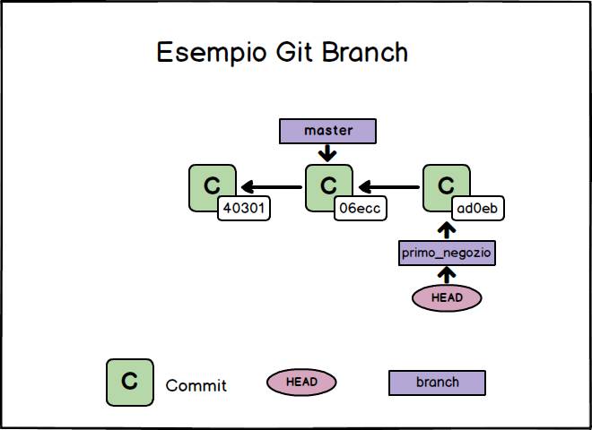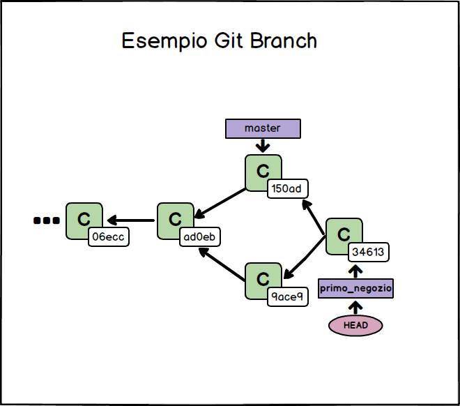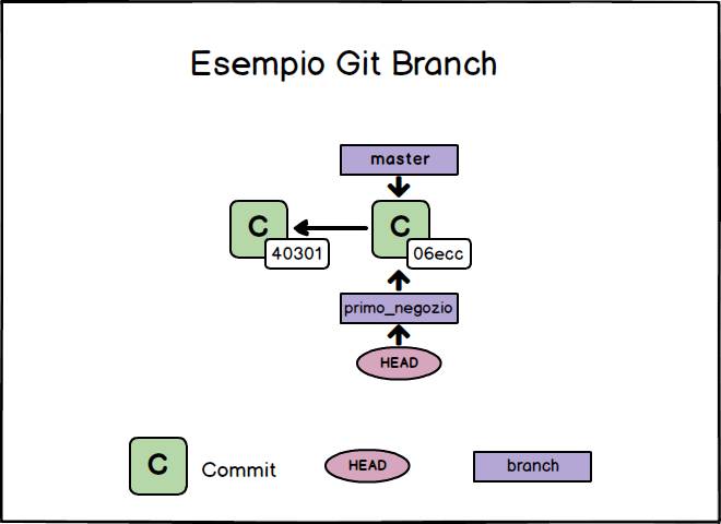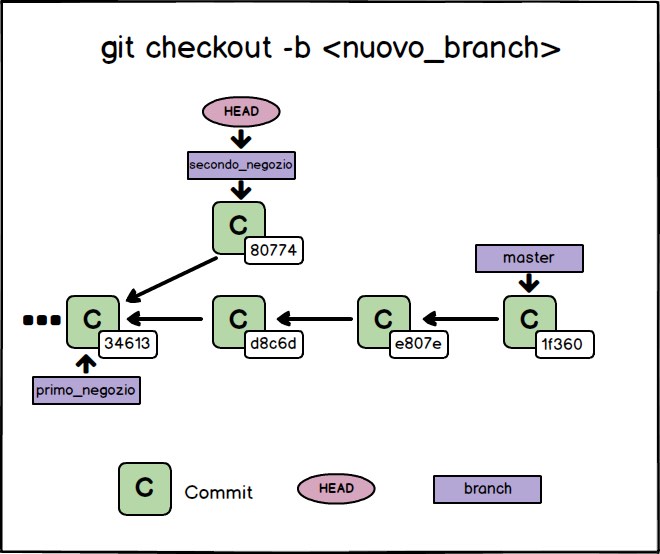 Attraverso il comando git checkout abbiamo cambiato il branch corrente, ovvero è stato cambiato il contenuto del file .git/HEAD. Il puntatore HEAD contiene ora un riferimento al branch primo_negozio che è quindi il branch corrente.