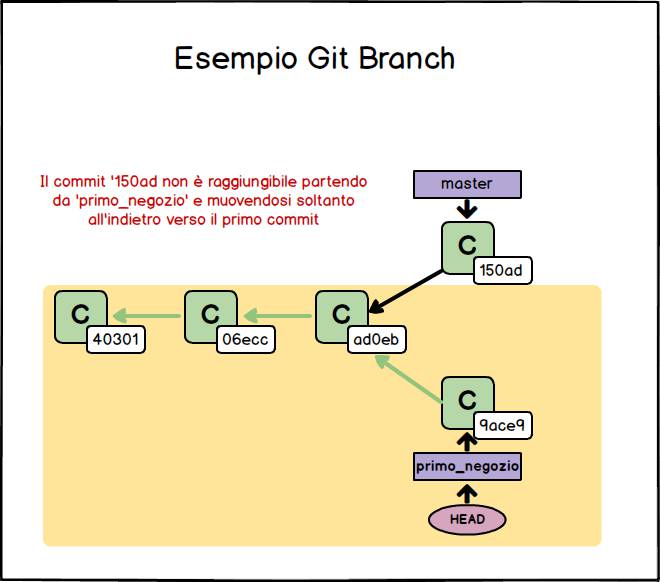 Come possiamo notare dall’output del comando git log e dall’immagine, è stato creato un nuovo commit sul branch primo_negozio che non fa però parte del branch master.