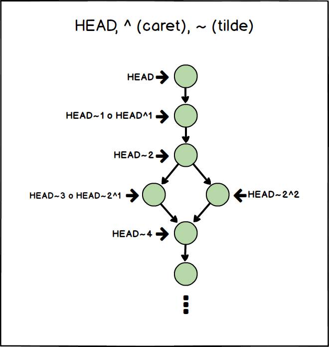 - Appendendo il suffisso ~<n> (tilde) indichiamo che vogliamo far riferimento a un commit che è n passi indietro seguendo il primo genitore (nel caso ci siano più genitori). Se n è uguale a 1, possiamo ometterlo. (~ è equivalente a ~1). Per esempio master~2 fa riferimento al commit che è due passi indietro rispetto al branch master. Con HEAD~ indichiamo il commit che precede HEAD.
