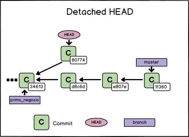 Git mostra un messaggio per metterci al corrente che siamo nello stato ‘detached HEAD’. Ogni volta che si effettua il comando git checkout passando come argomento un commit, HEAD entra in questo particolare stato. Una prima e evidente conseguenza è rappresentata dal contenuto del file .git/HEAD che solitamente contiene un riferimento a un branch. Se proviamo a visualizzare ora il suo contenuto, visualizzeremo al suo interno il valore identificativo del commit a cui punta ora HEAD.