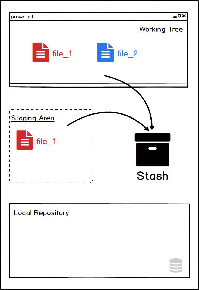 All’interno di quest’area possiamo inserire temporaneamente dei cambiamenti che vogliamo magari ripristinare o riutilizzare successivamente. Il comando da eseguire è git stash che prende le modifiche presenti nella working directory e nella staging area e le conserva all’interno di un’area provvisoria (con l’opzione -u possiamo chiedere a git stash di salvare anche i file Untracked) da cui potremo successivamente estrarle per riapplicarle con il comando git stash pop (le modifiche vengono rimosse dalla pila) oppure git stash apply (se vogliamo che le modifiche vengano mantenute comunque all’interno della pila).