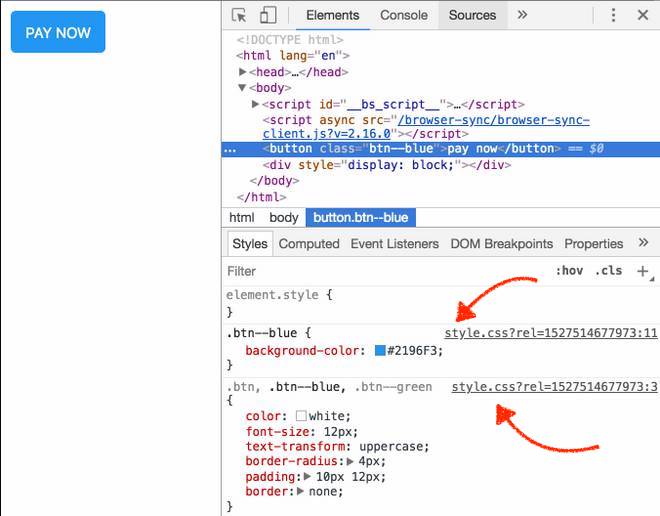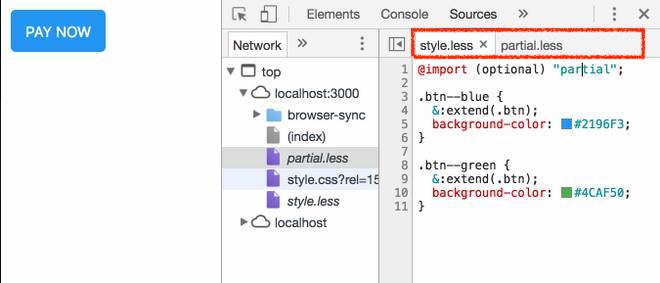 Uno dei problemi introdotti dall’uso di un preprocessore come Less, specialmente quando si utilizzano vari file che vengono importati con la direttiva @import, si manifesta in fase di debugging. Se infatti apriamo gli strumenti per sviluppatori del browser e ispezioniamo le regole applicate a un certo elemento, viene fatto riferimento solo al file CSS finale.