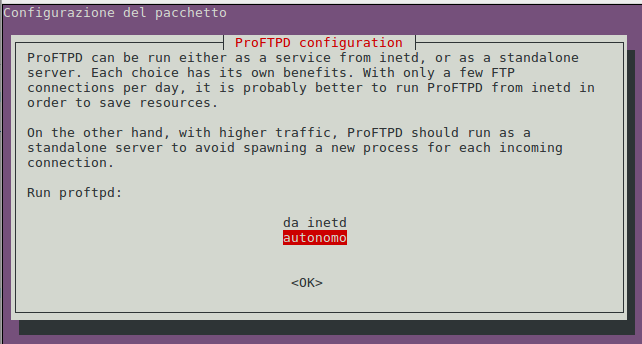 Ci viene richiesto in quale modalità vogliamo installare il nostra server FTP. Selezioniamo standalone (autonomo nella traduzione italiana).