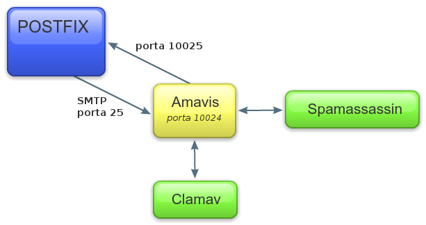 Prima di procedere con le installazioni e configurazioni vediamo concettualmente come sarà il funzionamento. Postfix riceve email dal web e passa il messaggio ad Amavis sempre tramite SMTP sulla porta 25. A questo punto Amavis gira la mail per i controlli a Spamassassin (software antispam) e a Clamav (software antivirus). Una volta che la mail è stata controllata Amavis decreta se questa è legittima o spam e la inoltra nuovamente a Postfix utilizzando la porta 10025. Di fatto amavis agisce come un proxy SMTP.
