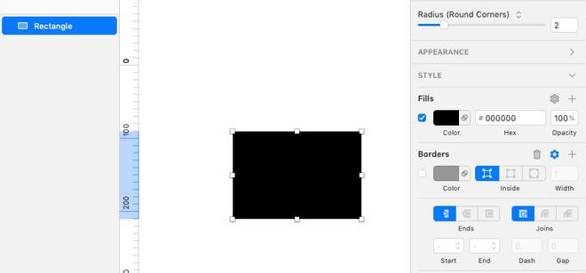 Nell’immagine in alto notiamo che è stato inserito un rettangolo con gli angoli arrotondati (Radius pari a 2) di colore nero. Per impostazioni predefinite, Sketch inserisce delle forme di colore grigio chiaro aventi dei bordi più scuri di spessore pari a 1px. Possiamo però cambiare questa scelta in pochi passaggi. Basta selezionare la forma appena inserita, cambiare il suo colore nell’inspector, decidere se rimuovere o modificare anche i bordi e quando abbiamo stabilito quale deve essere l’aspetto predefinito delle forme future, possiamo selezionare Layer > Style > Set as Default Style. Da questo momento in poi tutti i nuovi livelli inseriti avranno l’aspetto da noi personalizzato.