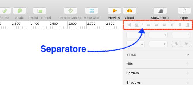 Nello strumento di allineamento abbiamo inizialmente trascurato i primi due pulsanti che servono a distribuire i livelli orizzontalmente (Control + Command + H) e verticalmente (Control + Command + H). In alternativa gli stessi comandi sono accessibili tramite il menu delle applicazioni (Arrange > Distribute Objects). Sketch provvederà a distanziare equamente i diversi livelli.