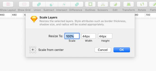 Per risolvere questo problema e scalare il livello e tutti i suoi elementi stilistici proporzionalmente, Sketch offre lo strumento Layer > Transform > Scale (Command + K) che consente di scegliere anche il punto di origine a partire dal quale effettuare l’operazione di ridimensionamento.