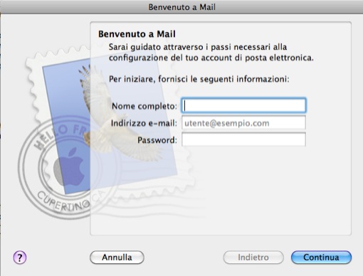Mail risulta essere un client di posta elettronica molto efficiente ed è molto simile, dal punto di vista delle funzionalità, al software Outlook di Microsoft. Quello che andremo a presentare in questo capitolo è la configurazione di un account di posta elettronica e relativa gestione. Apriamo dunque l’applicazione Mail e la prima schermata che verrà visualizzata sarà la seguente: