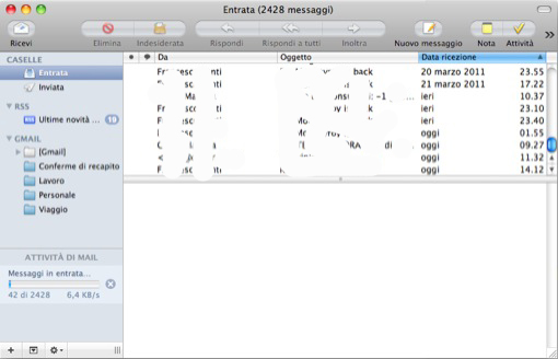 Facendo riferimento allo screenshot precedente nella parte bassa della colonna di sinistra è presente una sezione identificato dall’etichetta Attività di Mail. In questa sezione verranno inserite tutte le operazioni che Mail sta eseguendo in quel momento. Nello screenshot proposto, infatti, viene mostrata una barra di avanzamento, che fa riferimento alla posta in entrata. L’attività mostrata nello screenshot fa riferimento al download di tutti i messaggi di posta elettronica, dall’account al vostro Mac. Dopo l’inserimento dell’account di posta all’interno di Mail, la prima operazione che viene compiuta, è proprio quella di copiare i messaggi di posta sul vostro compuetr. Il download dei messaggi, non ha nessun effetto sul vostro account di posta, infatti i messaggi vengono solo copiati sul Mac e non eliminati dal server di posta.