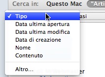 Facendo click sull’etichetta Tipo apparirà un menù nel quale è possibile scegliere la caratteristica del file per la quale vogliamo ridurre le ricerche.