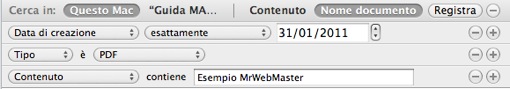 Andiamo dunque ad aprire una nuova finestra del finder e proviamo ad effettuare una ricerca: nella trattazione supporremo di ricercare la parola MrWebMaster e mostrerò gli screenshot relativi a questa ricerca sul mio computer.