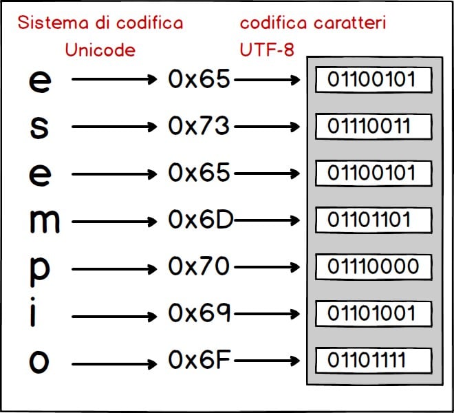 Come possiamo vedere dall’esempio, abbiamo creato un oggetto di tipo Buffer a partire dalla stringa ‘ciao’. Se ricordate, avevamo detto che un Buffer è un tipo di dato che contiene una rappresentazione in byte di un certo valore. In questo caso buffer5 conterrà la rappresentazione in byte di ogni lettera della parola ‘ciao’. Come sistema di codifica per convertire ogni carattere in un numero univoco viene usato il sistema Unicode e in particolare la codifica dei caratteri UTF-8. Nell’esempio in alto potete vedere la rappresentazione sia in formato esadecimale che decimale.