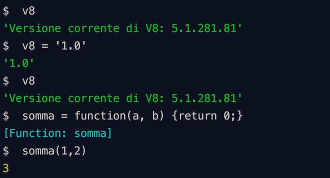 All’interno della nostra REPL abbiamo reso disponibili la variabile v8 che mostrerà a video la versione attuale del motore Javascript e una funzione somma che permetta semplicemente di sommare due valori. Per far ciò abbiamo usato il metodo Object.defineProperty() in modo tale che non possa essere cambiato il valore delle due proprietà dell’oggetto context da noi definite.