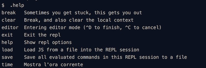 Digitando .help nella REPL, verrà mostrato un elenco di comendi che include anche quello aggiunto. Nella descrizione di .time si specifica che il comando serve per mostrare l’ora corrente.