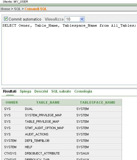 Scrivendo, infatti, la query come da esempio e premendo il tasto Esegui otterremo la visualizzazione di tutte le righe della tabella "All_Tables" (che è una tabella di sistema) per le colonne "Owner", "Table_Name" e "Tablespace_Name".