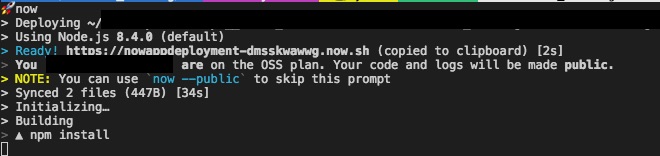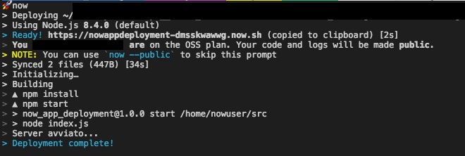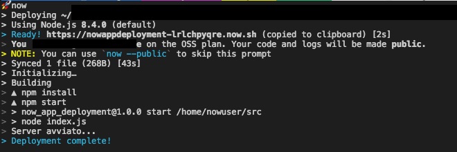 La prima volta che pubblichiamo un nuovo progetto, il processo è più lento. In seguito a modifiche del nostro progetto, possiamo lanciare nuovamente il comando now per aggiornare l’applicazione. In questo caso la procedura sarà più rapida rispetto alla prima pubblicazione.