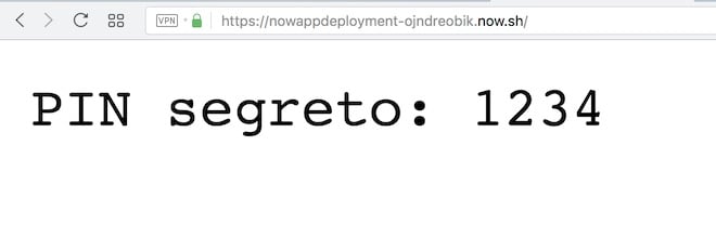 Nel file package.json abbiamo aggiunto alcuni comandi nuovi. Intanto definiamo sia i comandi start che build, ma aggiungiamo anche now-start e now-build che verranno eseguiti sul server durante la fase di configurazione della nostra applcazione. Abbiamo poi aggiunto il comando deploy che useremo per pubblicare la nostra applicazione. Notate che abbiamo usato il comando now con l’opzione -e. In questo modo possiamo definire delle variabili d’ambiente. In questo caso settiamo il valore di LANG pari alla stringa ‘it’. Per quanto riguarda SECRET_PIN, usiamo una sintassi particolare. Infatti, abbiamo lanciato il comando now secrets add secret_pin 1234 con il quale chiediamo di conservare in maniera protetta il valore di secret_pin a cui faremo poi riferimento nel file package.json attraverso la sintassi @secret_pin. L’uso di questa funzionalità può risultare utile per conservare sul server delle informazioni come dati di accesso a un database o token per usare l’API di servizi di terze parti.
