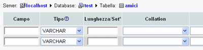 Nel nostro esempio inseriremo come nome dei (2) campi previsti, rispettivamente, "nome" e "telefono" e sceglieremo come tipo "varchar" con lunghezza 50 per il campo nome e "int" con lunghezza 10 per il campo telefono (in sostanza abbiamo precisato che il campo nome può contenere un massimo di 50 caratteri vari mentre il campo telefono può contenere un massimo di 10 numeri).