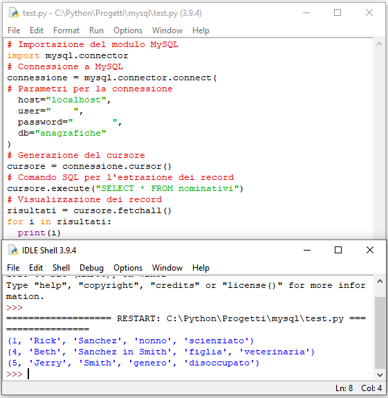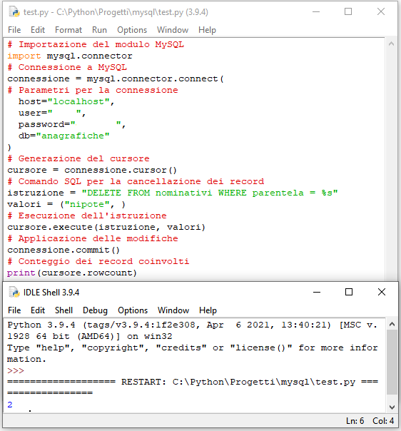 E’ inoltre possibile effettuare un controllo più completo sugli esiti della chiamata al comando DELETE FROM operando una rapida estrazione di tutti i dati presenti in tabella al momento corrente. Per far questo è sufficiente lanciare un’istruzione SQL basata sul comando SELECT in modo da ottenere una lista di tuple che, sottoposta ad un ciclo for, restituirà uno per uno tutti i record selezionati.