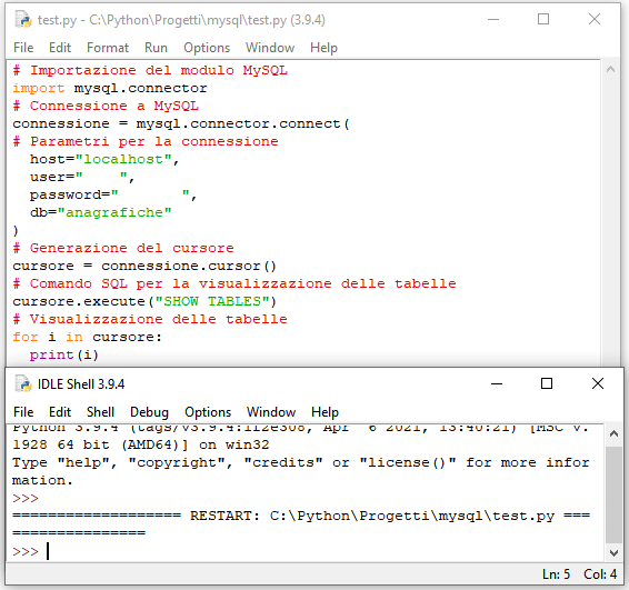 Una volta passata l’istruzione desiderata al metodo execute() è possibile effettuare un controllo sulle tabelle effettivamente contenute nel database utilizzato (nel nostro caso "anagrafiche") tramite una chiamata al già noto comando SQL SHOW TABLES: