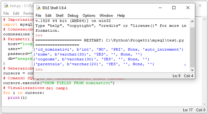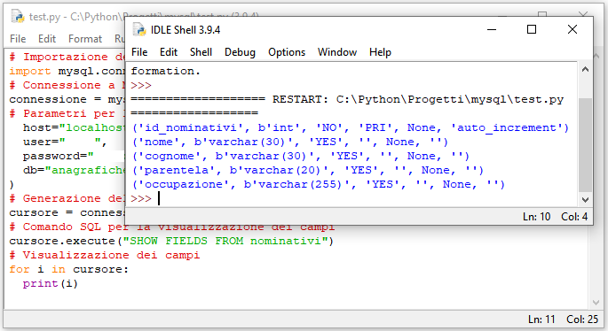 cursore.execute("SHOW FIELDS FROM nominativi")