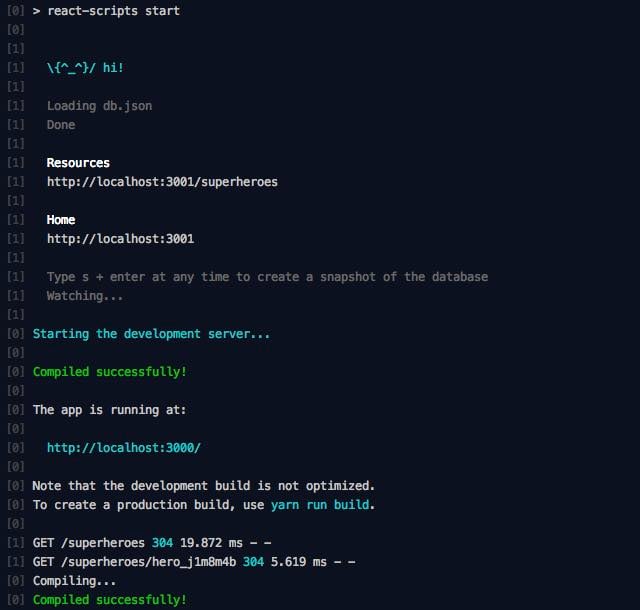 Sul lato sinistro dell’immagine potete notare un’alternanza di ‘[0]’ e ‘[1]’. È l’output generato da concurrently, dato che abbiamo eseguito due comandi concorrentemente. Ogni volta che il processo, lanciato con react-scripts start, stampa qualcosa nel terminale, vedremo uno ‘[0]’ seguito dal messaggio. Vedremo invece un ‘[1]’ seguito da un messaggio quando sarà JSON-server a stampare qualcosa. Potete per esempio notare il terzultimo rigo presente dell’immagine. In questo caso abbiamo effettuato una GET request visitando con il browser l’indirizzo http://localhost:3001/superheroes/hero_j1m8m4b.