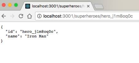 Se vogliamo invece ottenere le informazioni di un singolo supereroe dovremo effettuare una GET Request all’indirizzo http://localhost:3001/superheroes/{id}. Per esempio possiamo effettuare una GET Request all’indirizzo http://localhost:3001/superheroes/hero_j1m8oq0c e otterremo il seguente risultato.