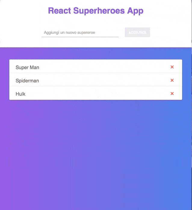In questo articolo realizzeremo una semplice applicazione come quella mostrata nell’immagine sottostate. Abbiamo una lista di supereroi che possiamo espandere. Possiamo inoltre rimuovere i singoli elementi dalla lista.
