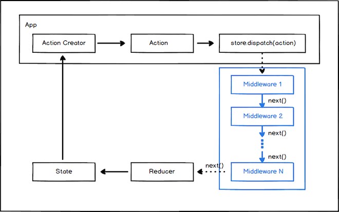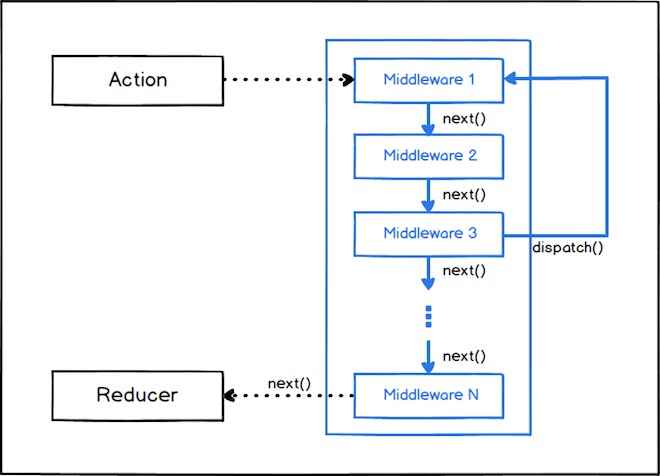 All’interno del middleware abbiamo accesso all’Action lanciata attraverso store.dispatch(action). Possiamo usere la funzione next(action) per far scorrere l’Action lungo la catena dei middleware. Eseguendo la funzione next(action) all’interno del nostro middleware, verrà invocato il prossimo middleware. È importante sottolineare che se all’interno del middleware non viene invocata la funzione next(action), l’Action non viene passata al prossimo middleware. Tutti i middleware successivi al middleware corrente non verranno invocati. A volte può risultare utile bloccare un’action, in questi casi non chiameremo la funzione next(). All’interno di ogni middleware abbiamo però accesso anche ai metodi store.getState() per recuperare l’oggetto State corrente e store.dispatch() che è la funzione dispatch() originale (in realtà è la funzione dispatch dell’oggetto middlewareAPI che comunque si limita ad invocare store.dispatch(action)). Utilizzando questa funzione, potremo far ripercorrere all’oggetto action tutta la catena dei middleware già attraversati prima del middleware corrente.