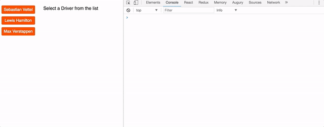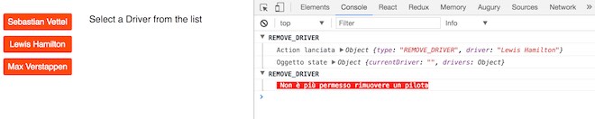 Se proviamo a rimuovere un pilota, noRemove intercetta l’action, stampa un messaggio di errore e non permette che l’action prosegua il suo cammino verso il rootReducer. Nel caso action.type sia uguale a REMOVE_DRIVER, l’action viene bloccata perché non invochiamo la funzione next(action) ma ci limitiamo a restituire l’oggetto action al middleware che precede noRemove, ovvero simpleLogger.
