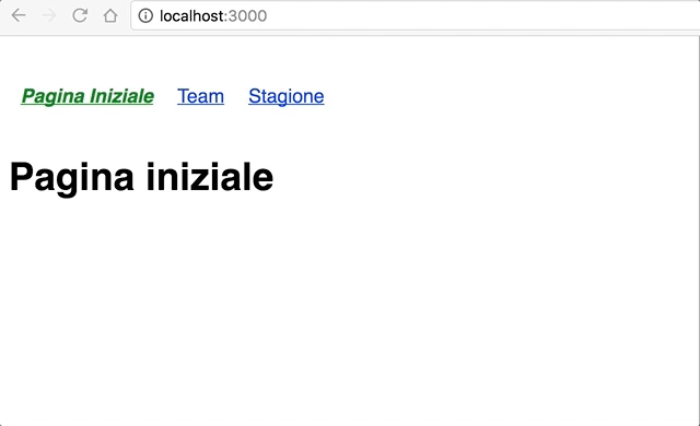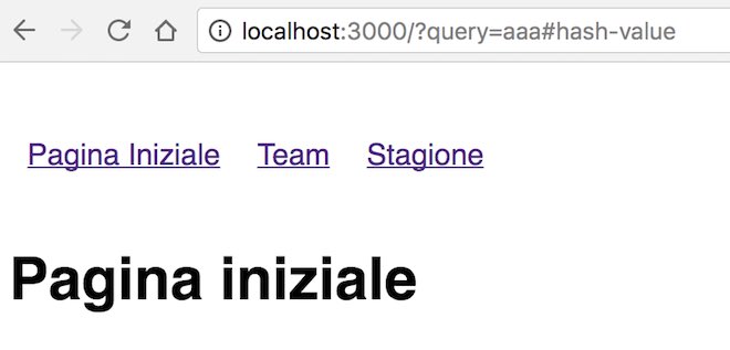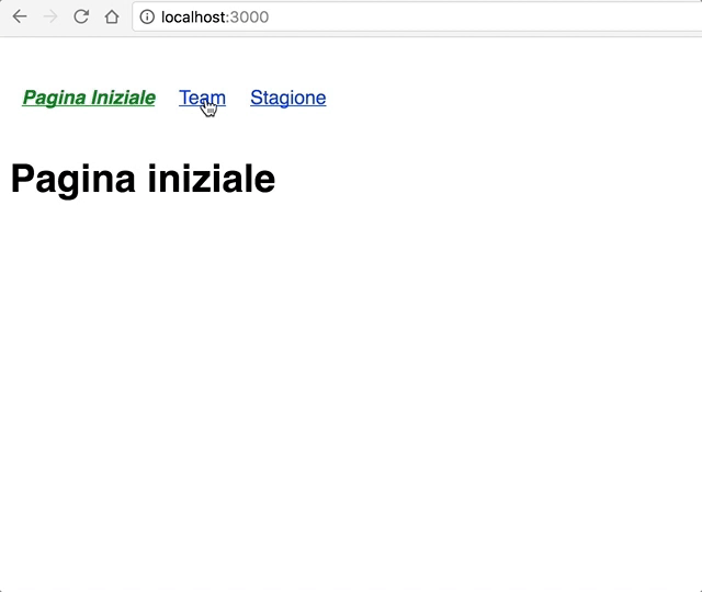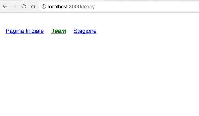 All’interno del componente Team, inseriamo due Link. Il primo ci porterà all’indirizzo localhost:3000/stagione, il secondo ci porterà alla pagina iniziale. In entrambi i casi, non verrà ricaricata la pagina del browser e la transizione avverrà in maniera dinamica. L’oggetto passato all’attributo to del secondo link, ci permette di specificare oltre al percorso (pathname) altre informazioni che saranno passate al componente Home tramite l’oggetto location.
