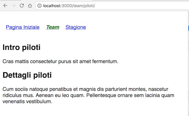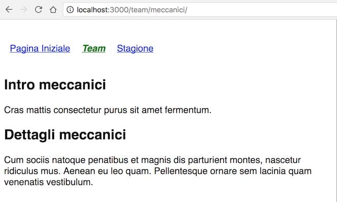 Potete vedere il risultato finale nelle immagini riportate qui sotto in cui abbiamo visitato prima l’indirizzo "localhost:3000/team/piloti" e poi "localhost:3000/team/meccanici".