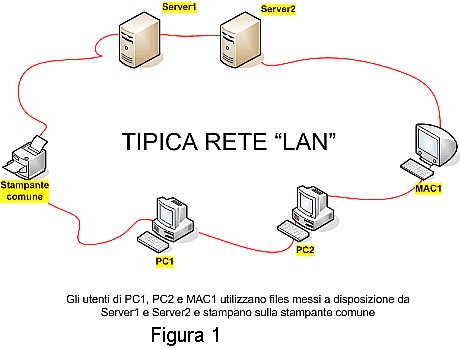 In fig. 1 è stata schematizzata una parte dell’hardware [PC1, MAC1, Server2, Stampante … etc.] ma ci sono altri dispositivi necessari al funzionamento della LAN (Local Area Network) che non appaiono nella figura e sono simboleggiati, nel loro complesso, dal disegno della “nuvola” che negli schemi relativi alle reti viene tipicamente usato per indicare tutto quello che non è fondamentale al livello di dettaglio dello schema stesso.