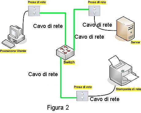 Al retro di ogni presa di rete e collegata una estremità di un’ulteriore cavo di rete (di colore verde in fig. 2) che, dopo aver percorso parecchi metri all’interno di canaline a muro o sotto i pavimenti o nelle controsoffittature, va a collegare l’altra estremità al retro di un “raccoglitore” detto “patch panel” e infine, dalla parte frontale di quest’ultimo, parte un’ulteriore tratto di cavo (talvolta definito “patch cord” ) che completa il circuito collegandosi ad una apparecchiatura detta “Switch” la cui funzione è quella di consentire il movimento delle informazioni fra i vari dispositivi di rete ad essa collegati.
