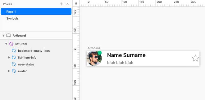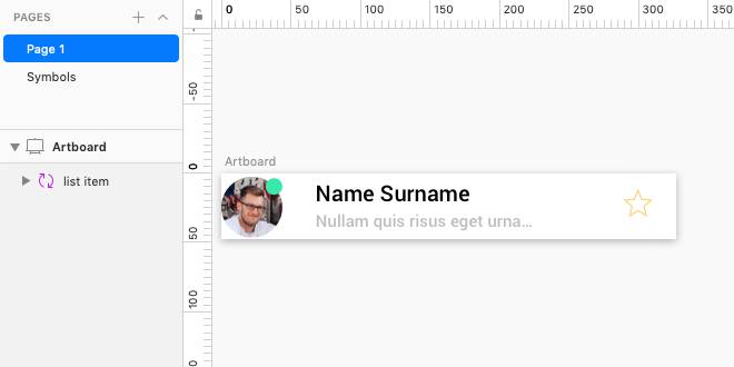 In Sketch, i simboli rappresentano un modo per riutilizzare degli elementi in più parti di un documento. Supponiamo di voler disegnare un’applicazione di messaggistica istantanea e di dover quindi realizzare un’artboard che presenta un elemento di una lista di contatti. Ciascun elemento della lista ha delle caratteristiche in comune come il nome, la foto del profilo ed altre informazioni simili.