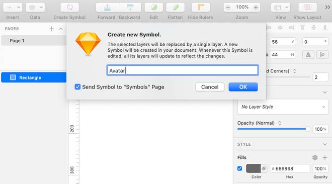 Per creare un simbolo si parte da un livello, da un gruppo o da un’artboard presente nell’area di lavoro di una delle pagine. Dopo averli selezionati, occorre scegliere Layer > Create Symbol dalla barra dei menu.