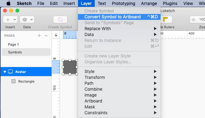 Se si desidera convertire nuovamente il simbolo master e trasformarlo in un semplice livello, occorre selezionare l’artboard contenente il simbolo master nella pagina Symbols e scegliere poi Layer > Convert Symbol to Artboard. Il simbolo master sarà convertito in un semplice livello e le istanze saranno trasformate in semplici gruppi.