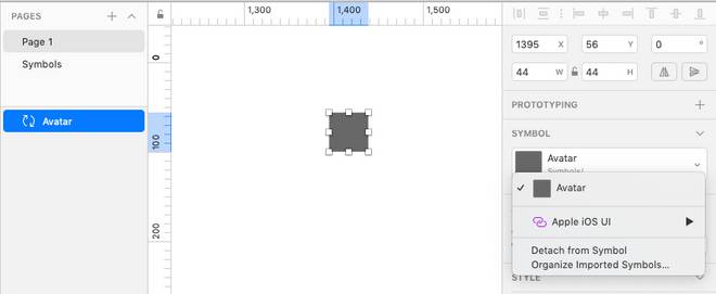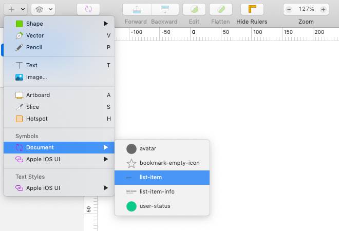 Abbiamo finalmente creato un simbolo che contiene a sua volta delle istanze di altri simboli. Se non lo abbiamo fatto in precedenza possiamo aggiungere un’istanza del simbolo list-item nella prima pagina del file. Nella lista dei simboli disponibili del documento corrente, sono elencati tutti i simboli creati finora.