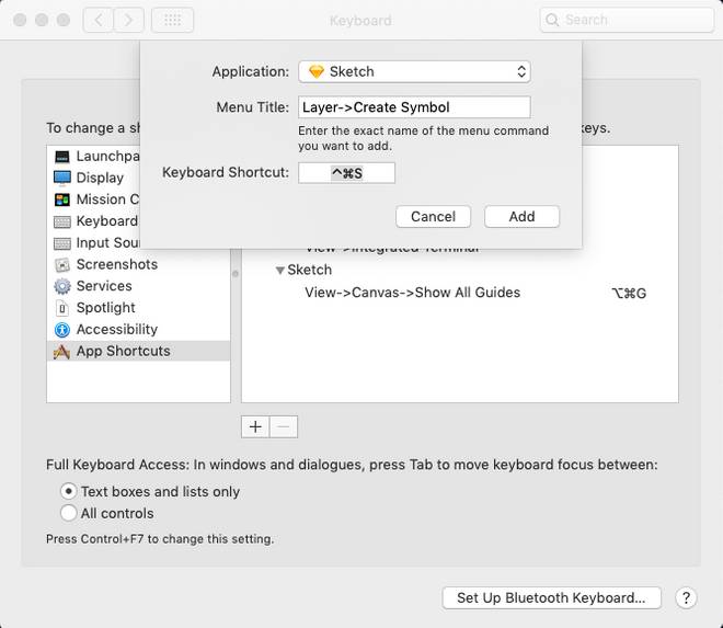 La creazione dei simboli in Sketch è un’operazione piuttosto frequente, per questo motivo possiamo creare una scorciatoia da tastiera personalizzata dato che non ne esiste una predefinita. Per far ciò occorre aprire le preferenze di sistema di macOS e selezionare la sezione ‘Tastiera’. Dobbiamo quindi attivare il pannello "Abbreviazioni", scegliere "Abbreviazioni app" nella colonna di sinistra e cliccare sul pulsante Aggiungi ‘+’.