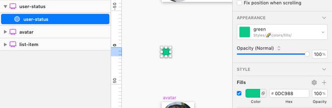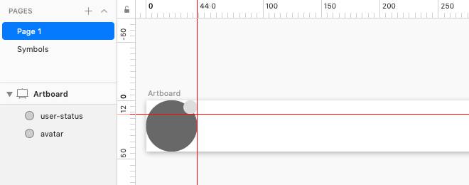 Inseriamo quindi due cerchi di dimensioni 44×44 e 12×12, disposti come nell’immagine sottostante, che rinominiamo rispettivamente avatar e user-status.