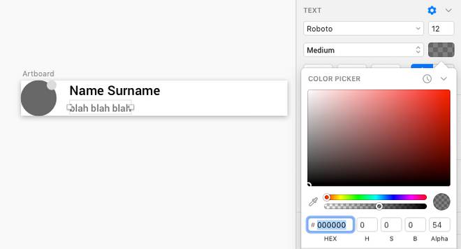 Aggiungiamo poi due campi di testo posizionati uno sopra l’altro ed inseriti in un unico gruppo. Entrambi usano il tipo di carattere tipografico Roboto, che è scaricabile gratuitamente da Google Fonts, con valore font weight pari a Medium. La dimensione dei caratteri del testo superiore è pari a 16 con line-height uguale a 24. I caratteri del campo di testo sottostante sono invece di dimensione 12 (line-height pari a 18). Il colore è nero per entrambi, ma nel secondo caso l’opacità è uguale a 54. Il testo è allineato a sinistra per entrambi.