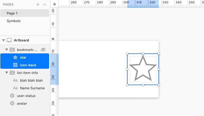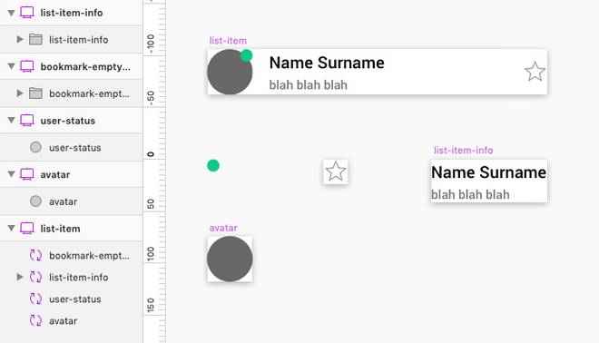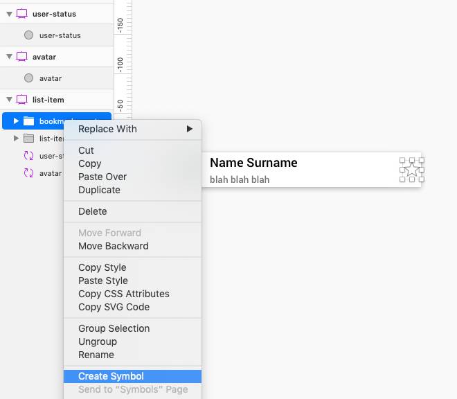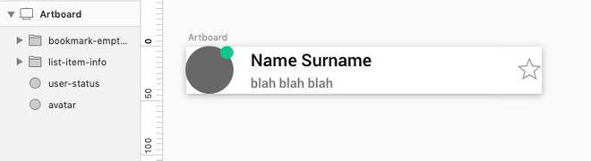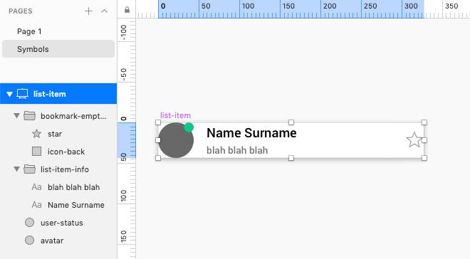 Siamo dunque riusciti a creare un simbolo che presenta al suo interno vari livelli e gruppi. Possiamo però strutturare meglio il simbolo master trasformando i vari elementi che lo compongono (avatar, user-status, il gruppo ‘list-item info’ e il ‘gruppo bookmark empty icon’) in dei simboli.
