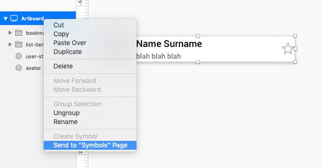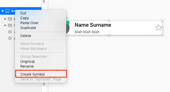 Proseguiamo allora creando un nuovo simbolo e cliccando col tasto destro del mouse sul nome dell’artboard nella lista dei livelli. Scegliamo poi l’opzione Create Symbol del menu contestuale (In alternativa possiamo usare la scorciatoia da tastiera che abbiamo creato nelle impostazioni di sistema del sistema operativo).