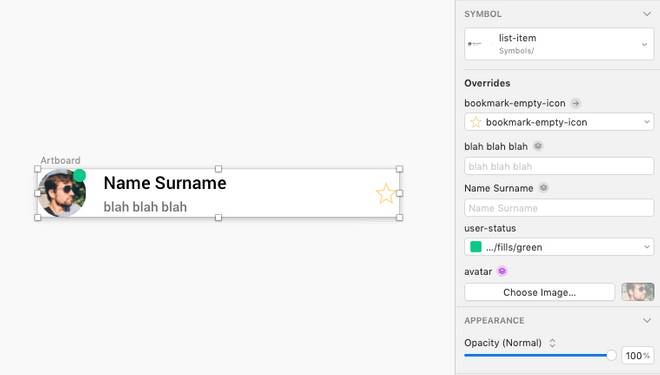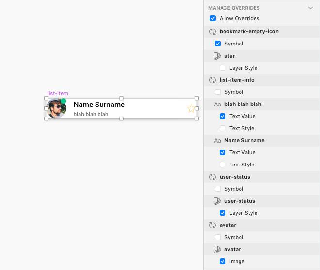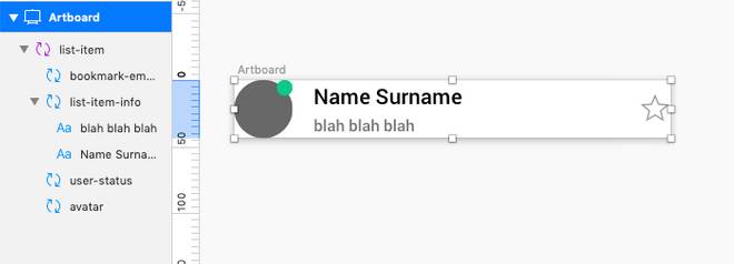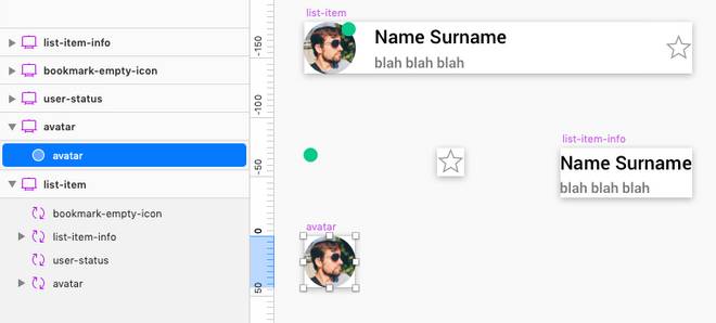 Se controlliamo quindi l’istanza di avatar presente nel simbolo master list-item, notiamo che Sketch ha automaticamente effettuato le modifiche necessarie dopo l’ultimo aggiornamento.