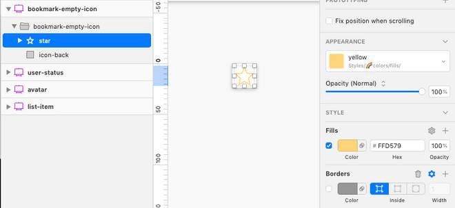 Spostiamoci poi nella pagina Symbols, selezioniamo l’icona a forma di stella nel simbolo master bookmark-empty-icon e convertiamola utilizzando lo strumento Layer > Convert to Outlines in modo da avere una forma in cui cambiamo il colore di riempimento andando a selezionare il colore ‘colors/fills/yellow’ nella sezione ‘Appearance’ dell’Inspector.