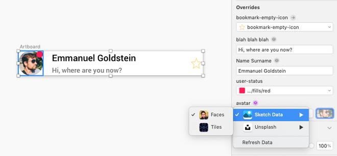 Iniziamo a modificare il simbolo master avatar e per farlo ci affidiamo alla funzionalità Data di Sketch che approfondiremo in avanti. Selezioniamo dunque il cerchio presente nel simbolo master e, tramite il pulsante Data della barra degli strumenti, usiamo come sfondo un’immagine casuale con il volto di una persona.