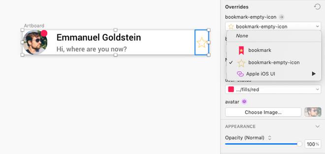 Se nella sezione Overrides relativa all’istanza di un simbolo apriamo però il menu a cascata per sostituire il simbolo bookmark-empty-icon, non sarà presente nessuna alternativa al simbolo corrente.