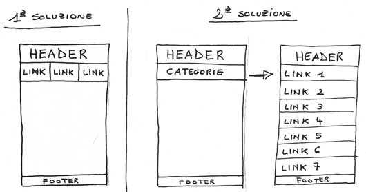 La porzione centrale della pagina, a sua volta, sarà destinata ad ospitare altri spazi (che variano a seconda delle esigenze). Un elemento imprescindibile, ovviamente, è il menu di navigazione attraverso il quale accedere alle altre pagine/aree del sito. Se queste sono poche (1a soluzione) è possibile creare direttamente una barra con i link necessari, in caso contrario – per esigenze di spazio – è meglio aggiungere un unico bottone che, una volta premuto, mostri l’elenco di tutte le pagine/aree disponibili (2a soluzione).